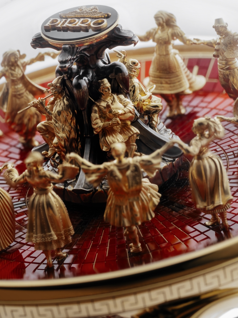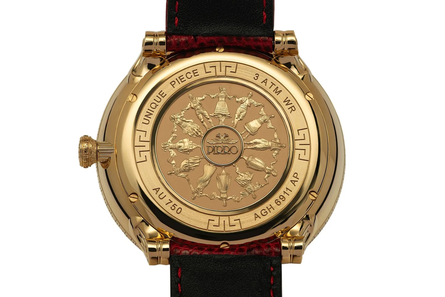 On top of the domed sapphire crystal, just above the four musician figurines, a black onyx Pirro logo is centered. Around back, engraved in micro-relief, is an illustrated scene representing traditional folk dancers. The watch comes with a genuine leather lizard strap held by an 18k yellow-gold pin buckle.