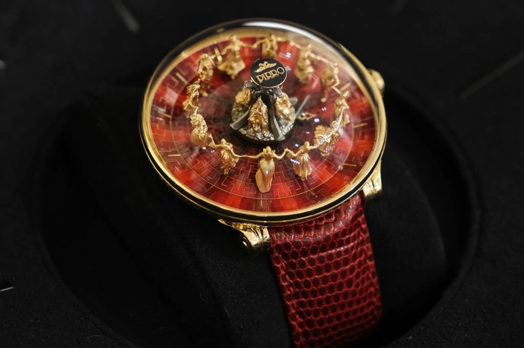 The dial of Primordial Passion, a one-of-a-kind watch by the Pirro brand in Albania, is dominated by 12 tiny gold folk dancers, each a third of an inch tall. They stand atop a red and black surface of 1,500 Murano glass mosaic pieces that were positioned, one by one, by the brand’s founder, Pirro Ruco, using a new technique he called “Pirro texture golden borders.”