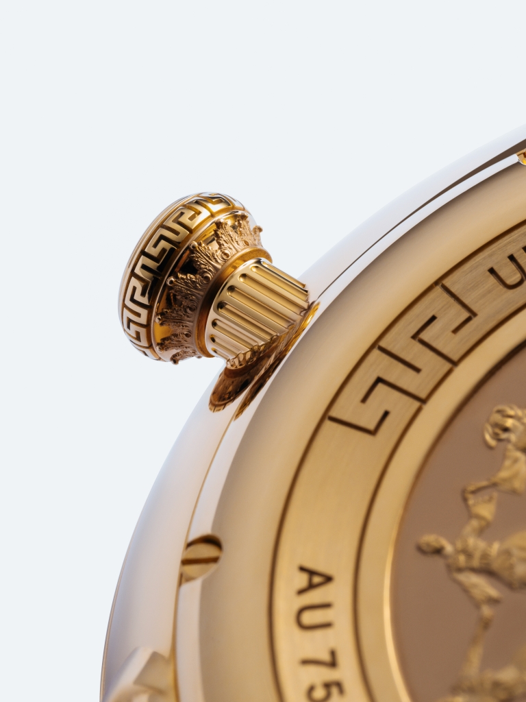 All the gold components, including the figurines and the case, which measures 46.5mm in diameter (the sapphire crystal dome reaches a height of 22mm), have been produced in-house by Pirro. Finally, theme extends to the solid gold caseback, which is engraved with a rendering of the dial scene in micro-relief.