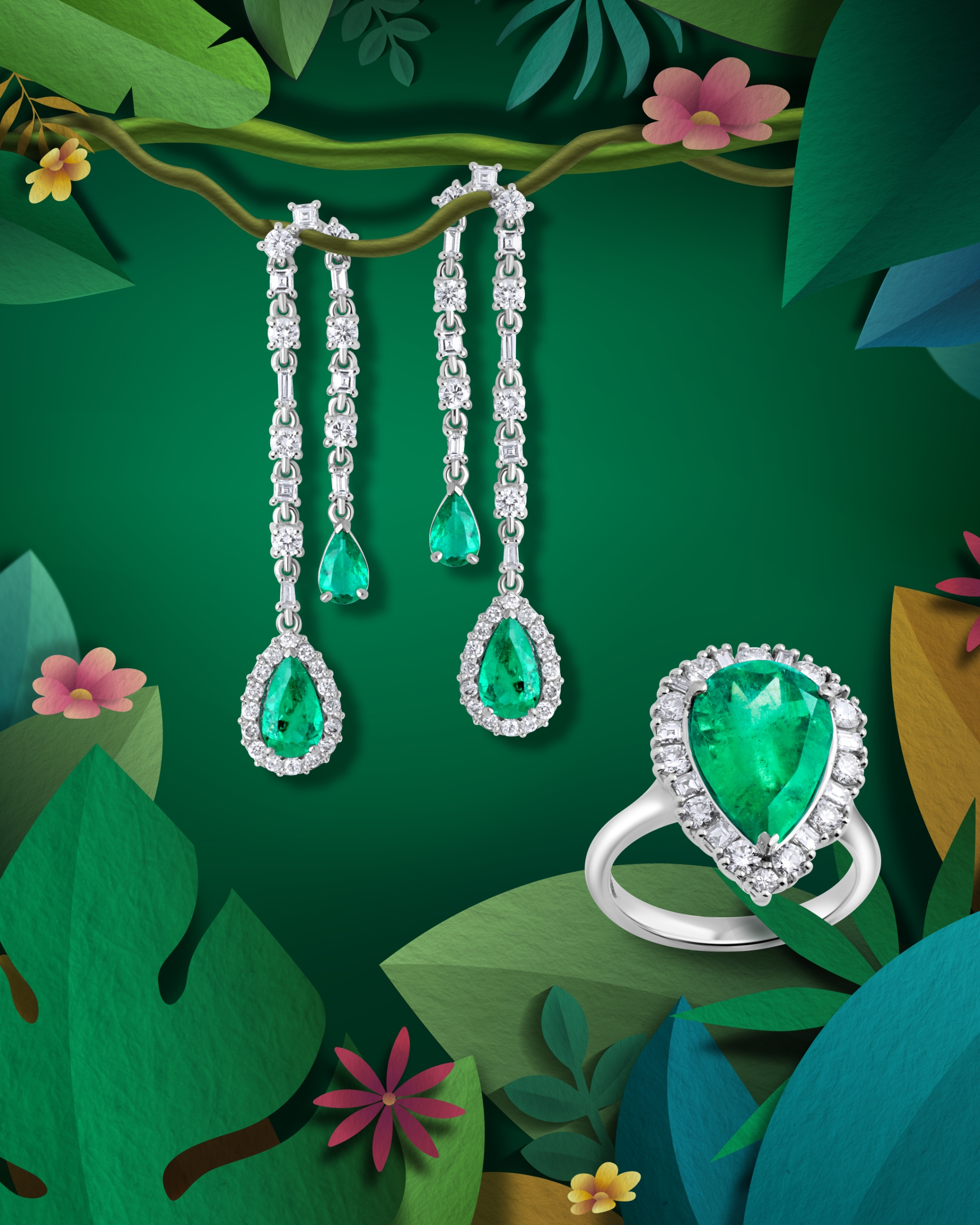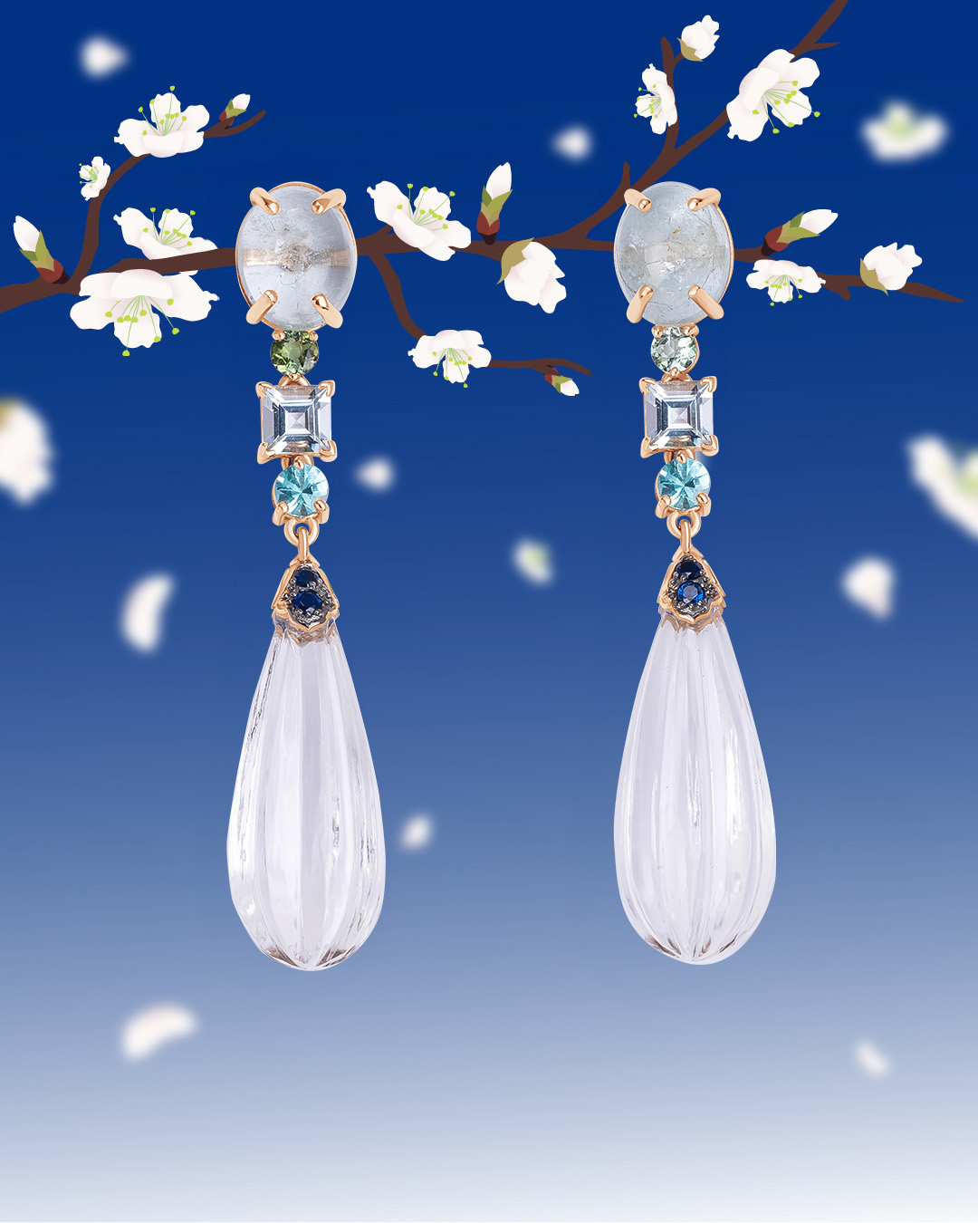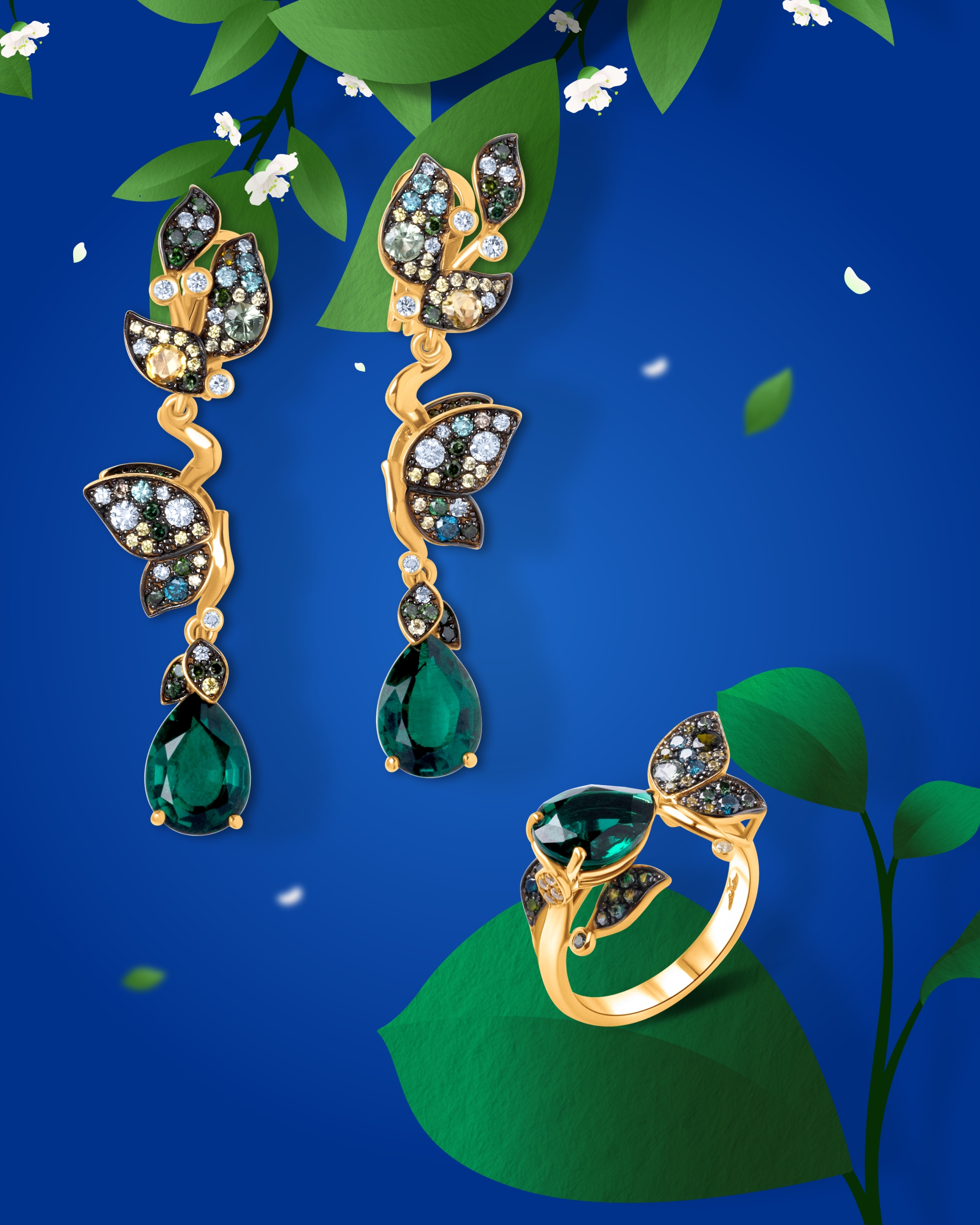 The collection draws on the sensory power of spring: soft tones of blooming flora, vibrant bursts of gemstone color, and textures that echo leaves, vines, and delicate petals. From intricate earrings and floral-inspired necklaces to statement rings set with aquamarine, morganite, and peridot, each piece is designed to evoke the freshness and vibrancy of a secret garden.