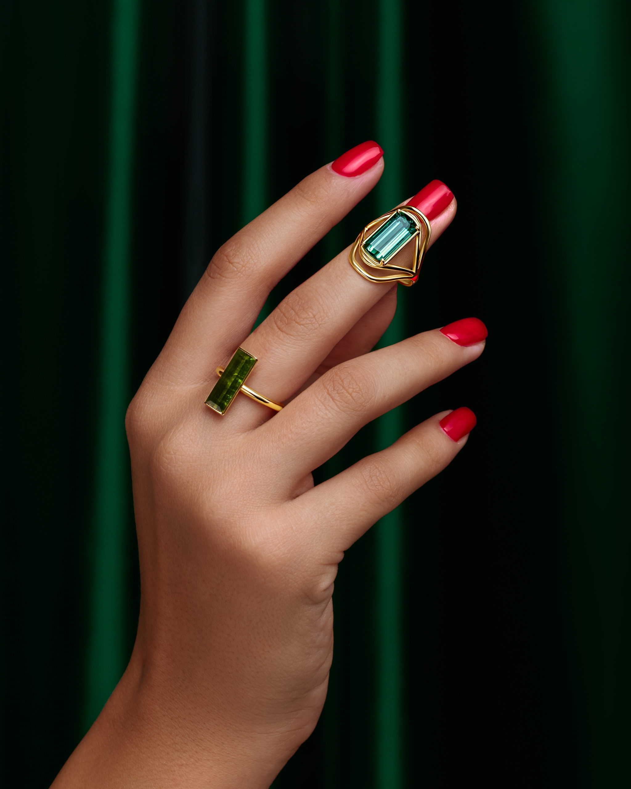 This campaign embodies the essence of timeless elegance through contrast: the strength of gold against the softness of green, the boldness of statement designs balanced by Pirro’s meticulous artistry. Each piece captures a sense of quiet power—luxury that is not ostentatious but confident, refined yet daring. The gold evokes stability and permanence, while the green stones, whether emerald, tourmaline or peridot, add life, freshness and an almost poetic sense of renewal.
