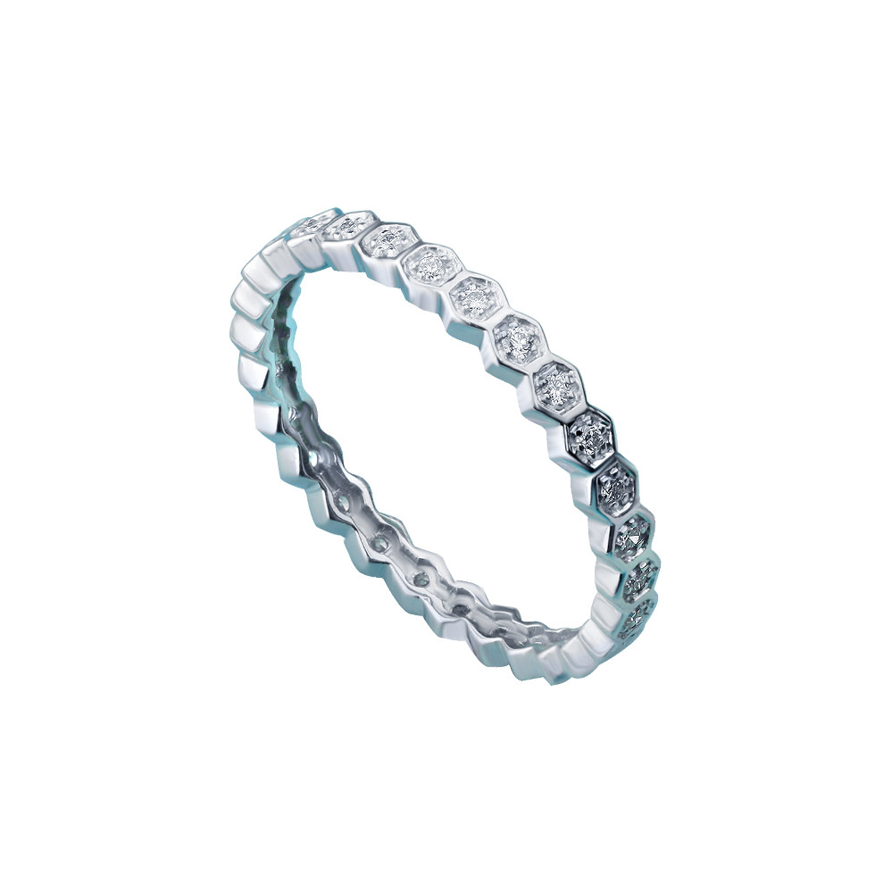Elegant and unique this white gold band is beautifully set with pave zircons in honeycomb motif band
