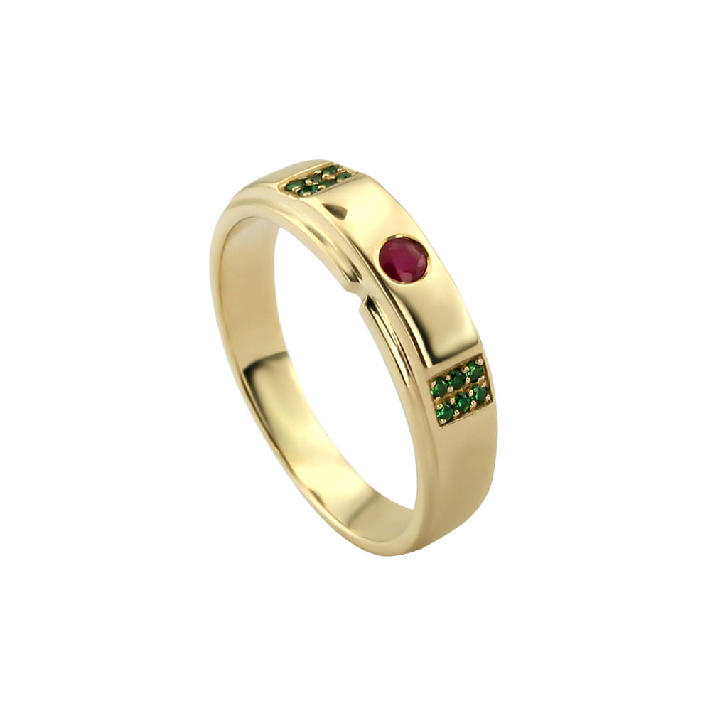 Vibrant center ruby is surrounded by six emeralds on each side on this elegant yellow gold mens ring