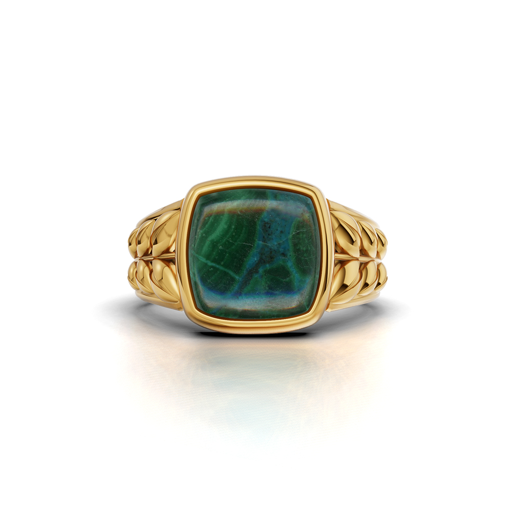 A bold statement ring featuring a 7.05 ct oval-cut chrysocolla, beautifully set in 14K yellow gold with sculpted side details that highlight the stone’s rich blue-green tones.