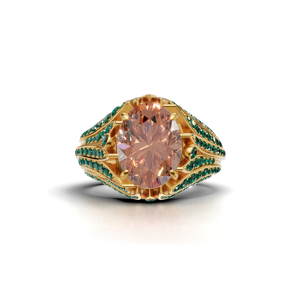 A commanding natural tourmaline center stone sits elevated in 14K yellow gold, its warm hues contrasted by pavé-set lab emeralds (0.94 ct total) flowing along sculpted leaf-shaped shoulders bold, architectural, and unmistakably one of a kind.