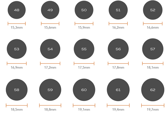 Use a ruler or a caliper to measure the inside diameter of the ring and find the equivalent diameter of one of the circles. For example, if your ring has an inside diameter of 16.6 mm, this will correspond to size 52. If the diameter falls between two sizes, choose the larger size.